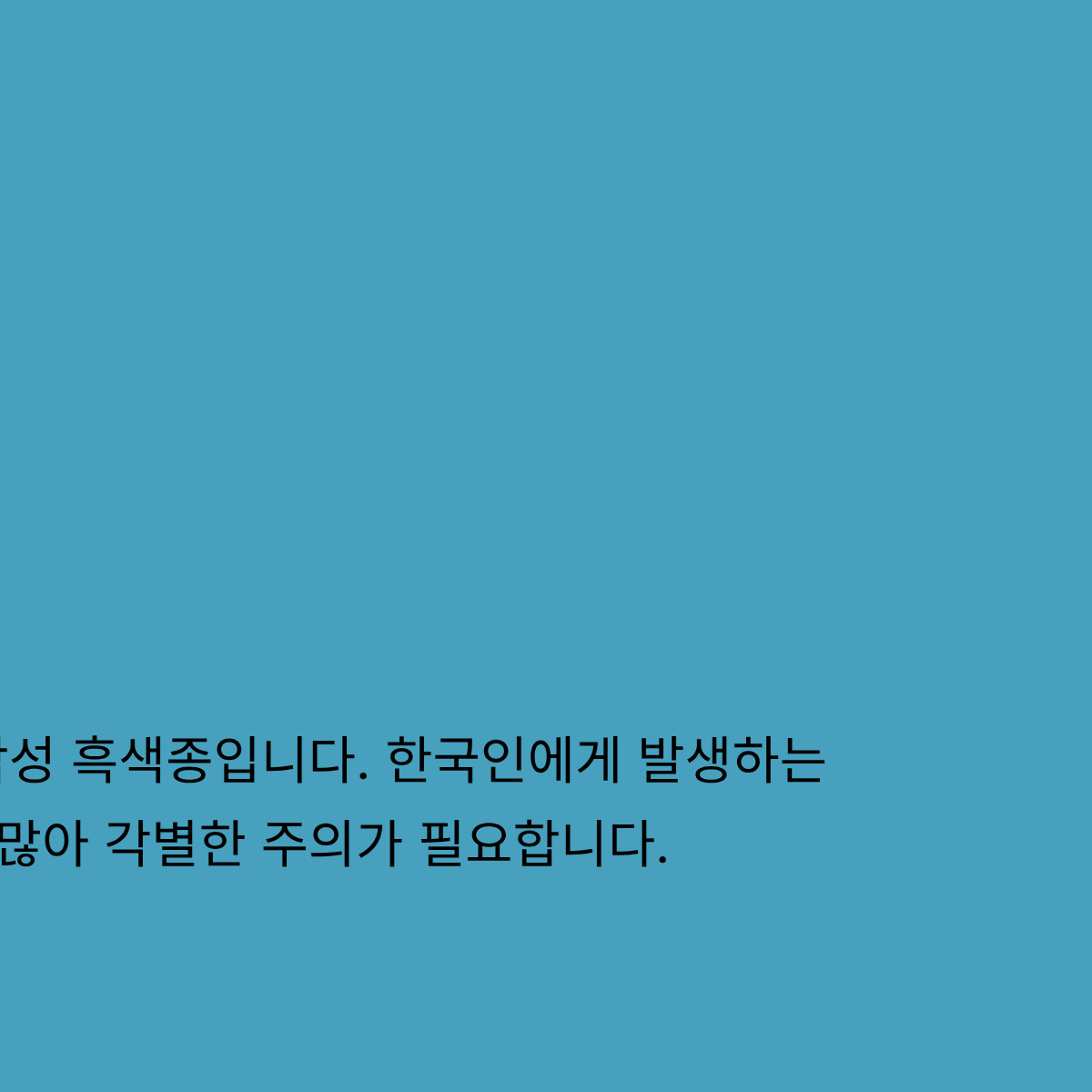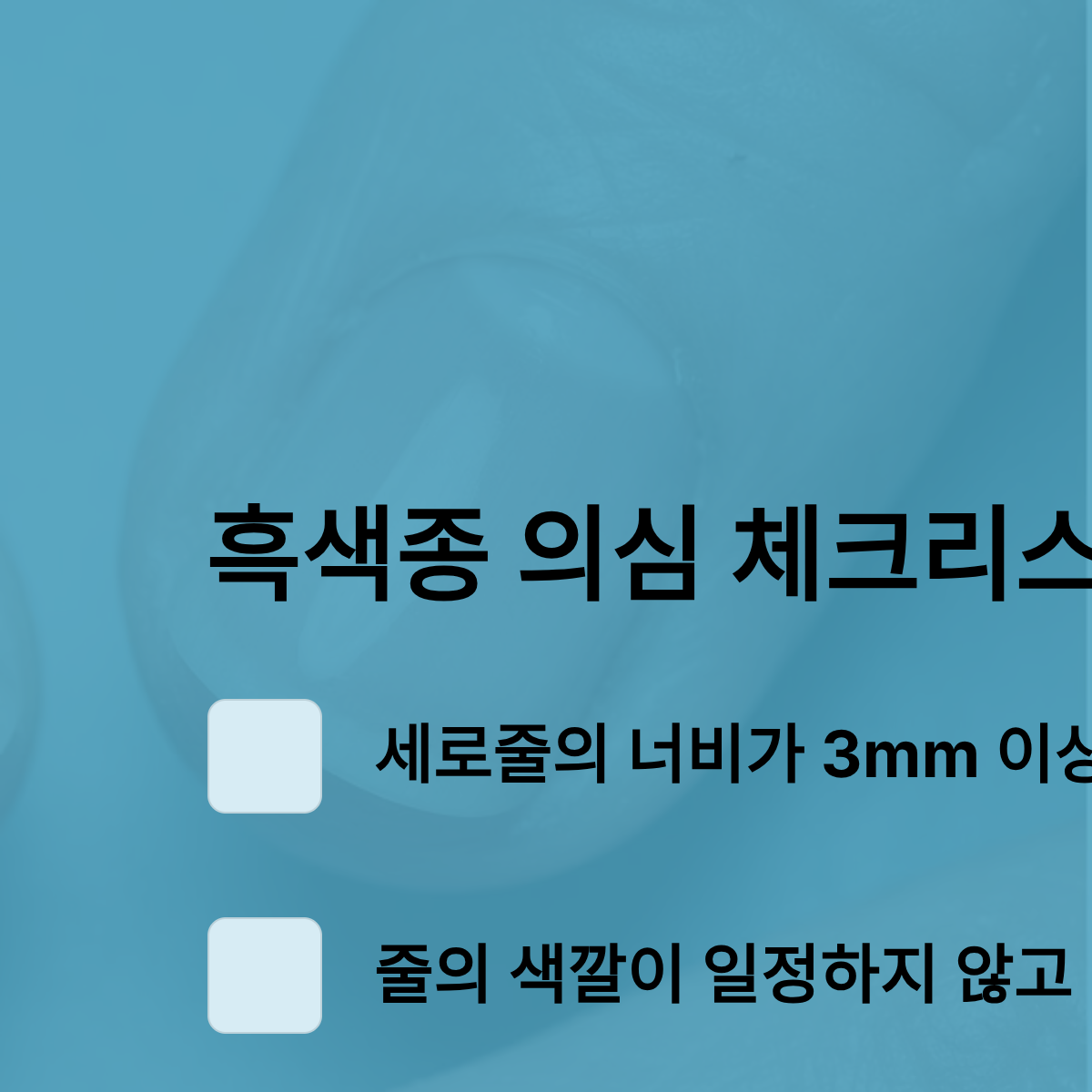 * 동양인은 서양인에 비해 피부 흑색종은 적지만, 손발톱밑 흑색종 비중은 상대적으로 높으므로 유전적 요인보다 신체 변화에 집중하세요.