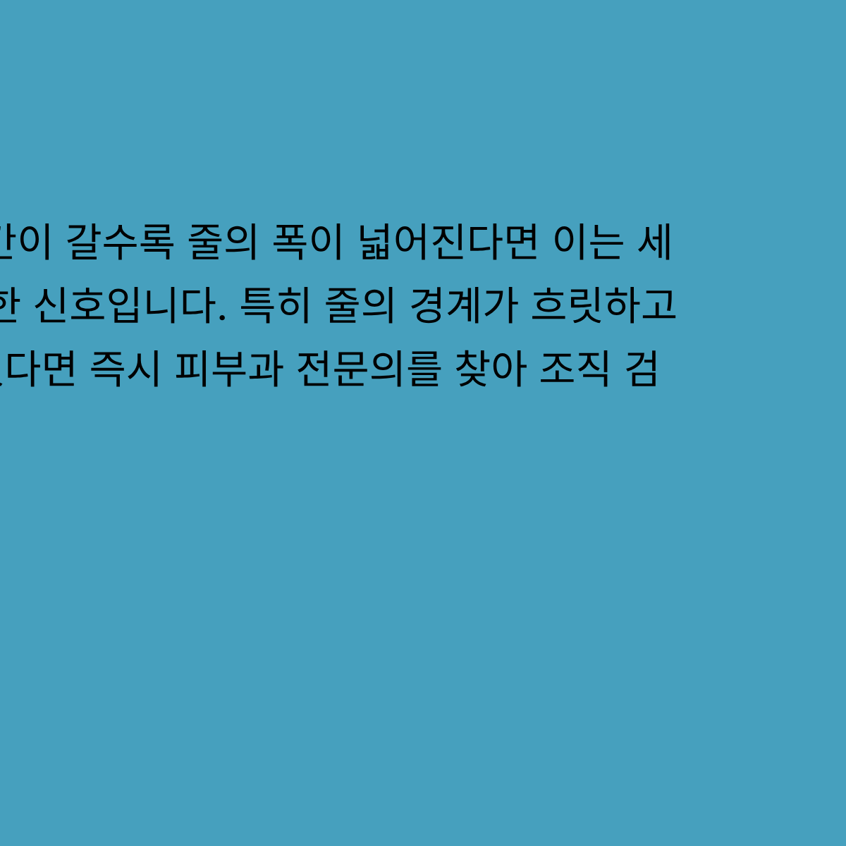 세로줄의 너비가 3mm를 넘어가거나, 시간이 갈수록 줄의 폭이 넓어진다면 이는 세포가 비정상적으로 증식하고 있다는 강력한 신호입니다. 특히 줄의 경계가 흐릿하고 검은색, 갈색, 회색 등 여러 색이 뒤섞여 있다면 즉시 피부과 전문의를 찾아 조직 검사를 받아야 합니다.