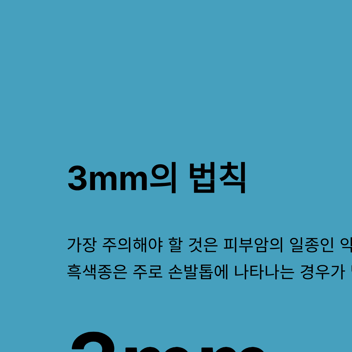 가장 주의해야 할 것은 피부암의 일종인 악성 흑색종(Subungual Melanoma)입니다. 한국인에게 발생하는 흑색종은 주로 손발톱에 나타나는 경우가 많아 각별한 주의가 필요합니다. 의학계에서는 이를 구분하기 위해 'ABCDEF 법칙'을 사용하는데, 그중 가장 직관적인 기준은 '3mm의 법칙'입니다.