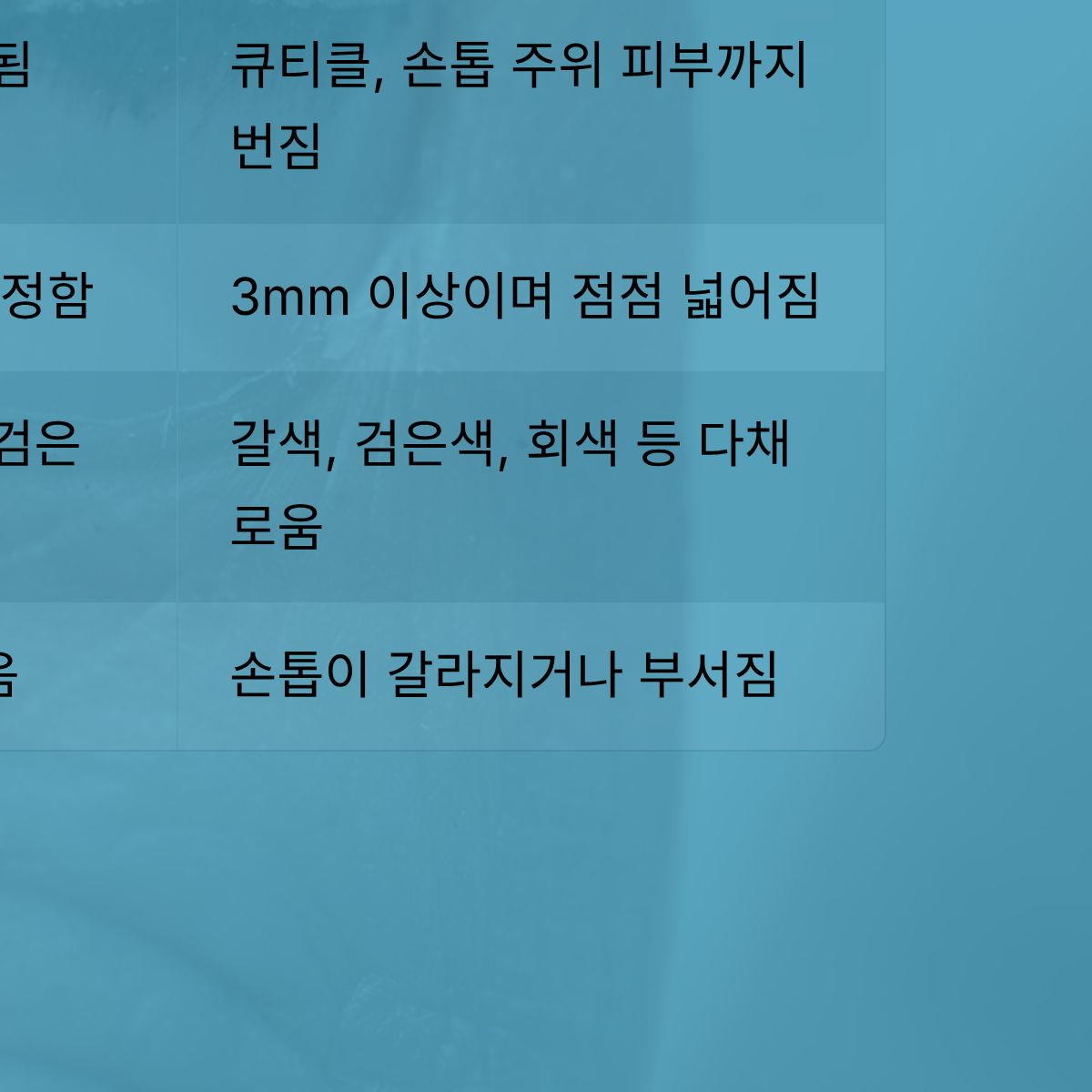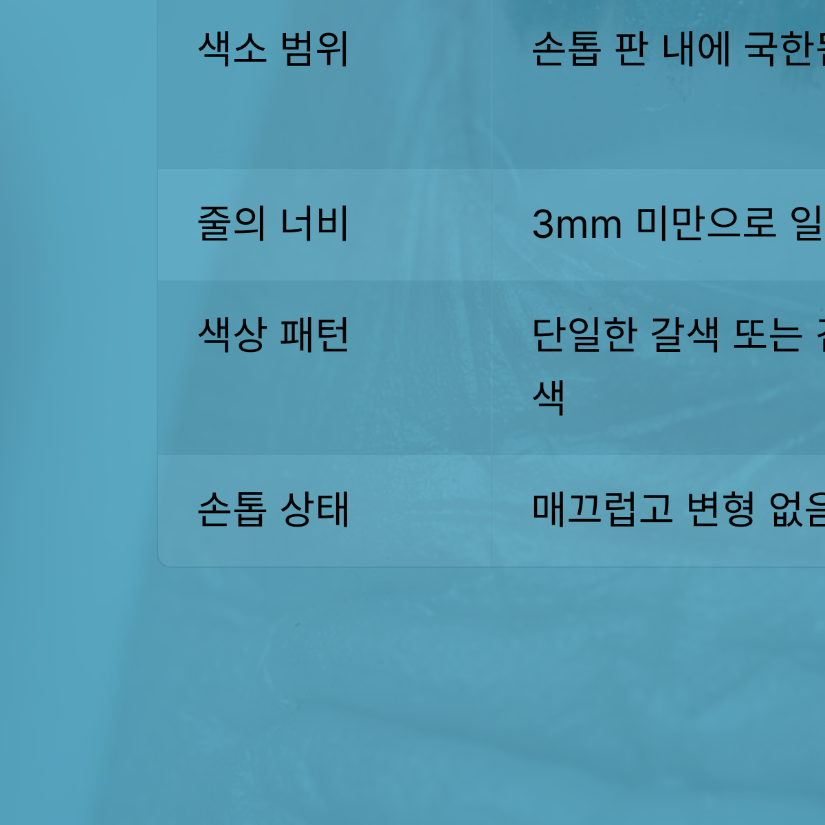 | 손톱 상태 | 매끄럽고 변형 없음 | 손톱이 갈라지거나 부서짐 | 구조적 파괴 |