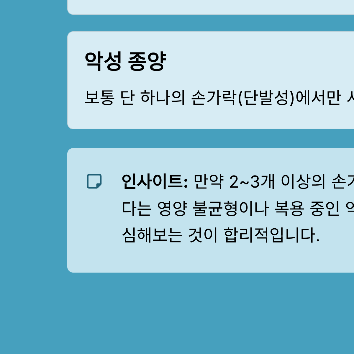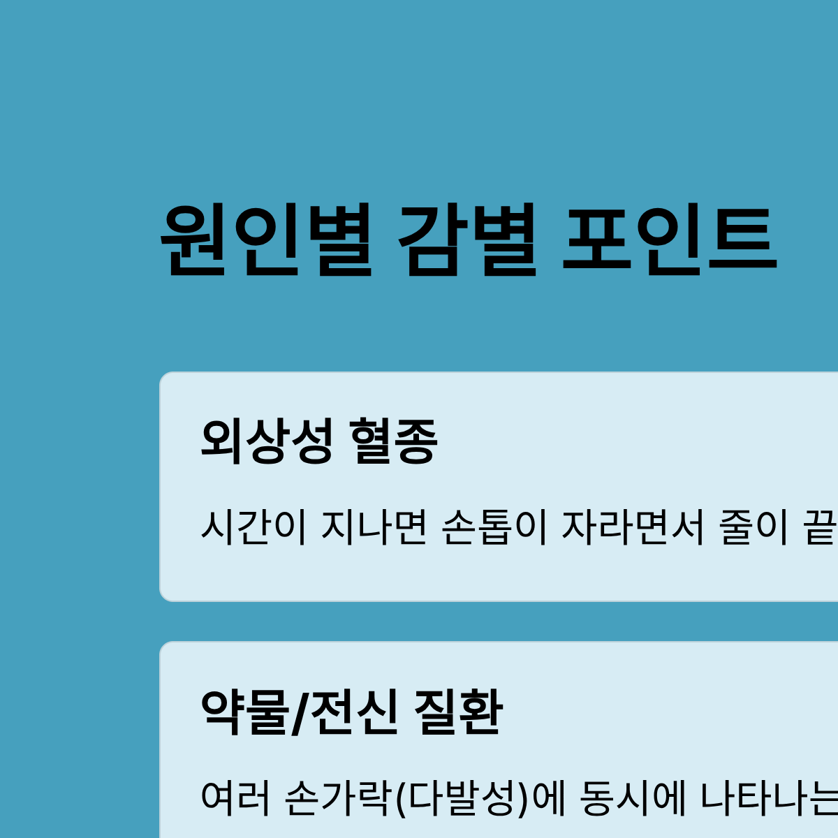 * 약물/전신 질환: 여러 손가락(다발성)에 동시에 나타나는 경향이 있음.