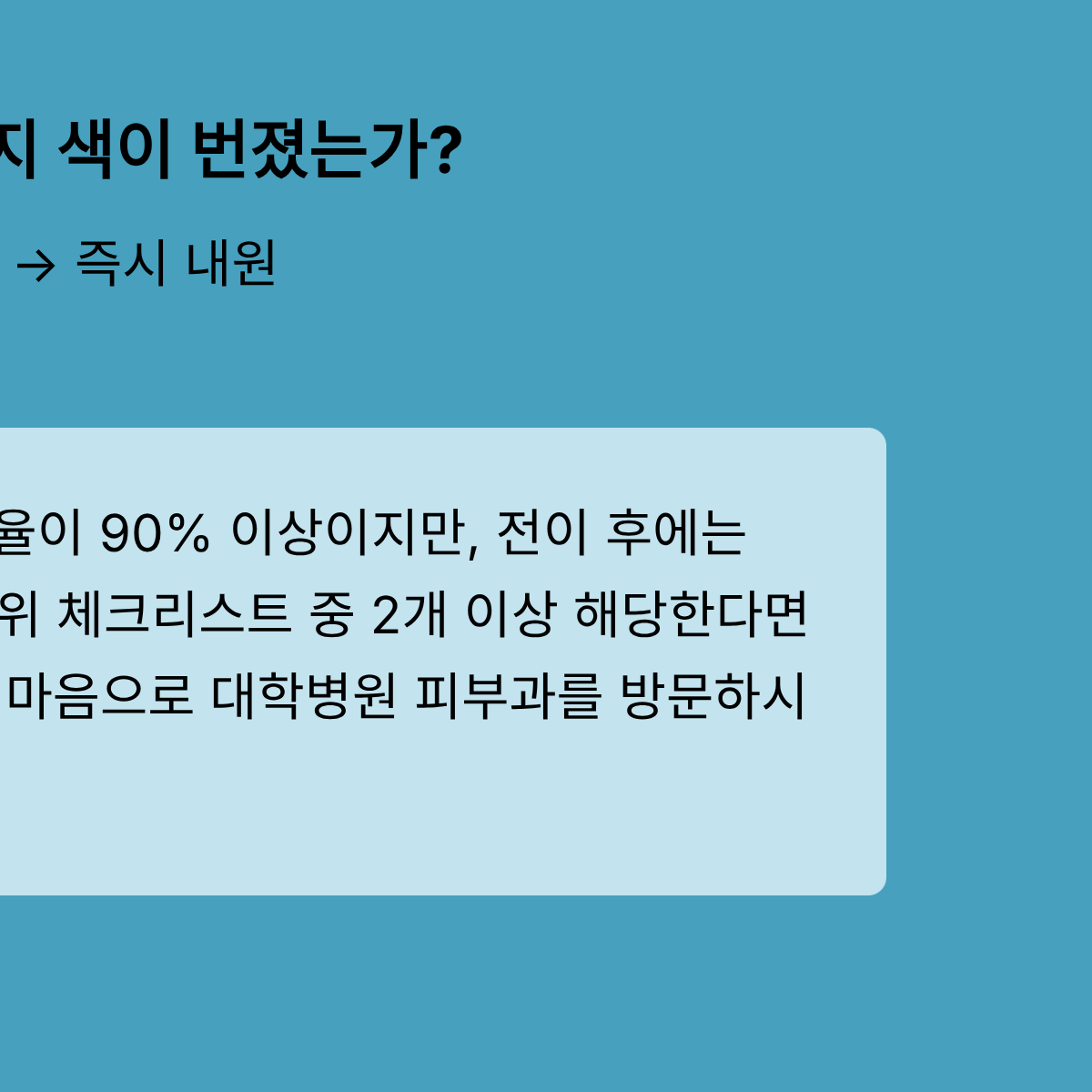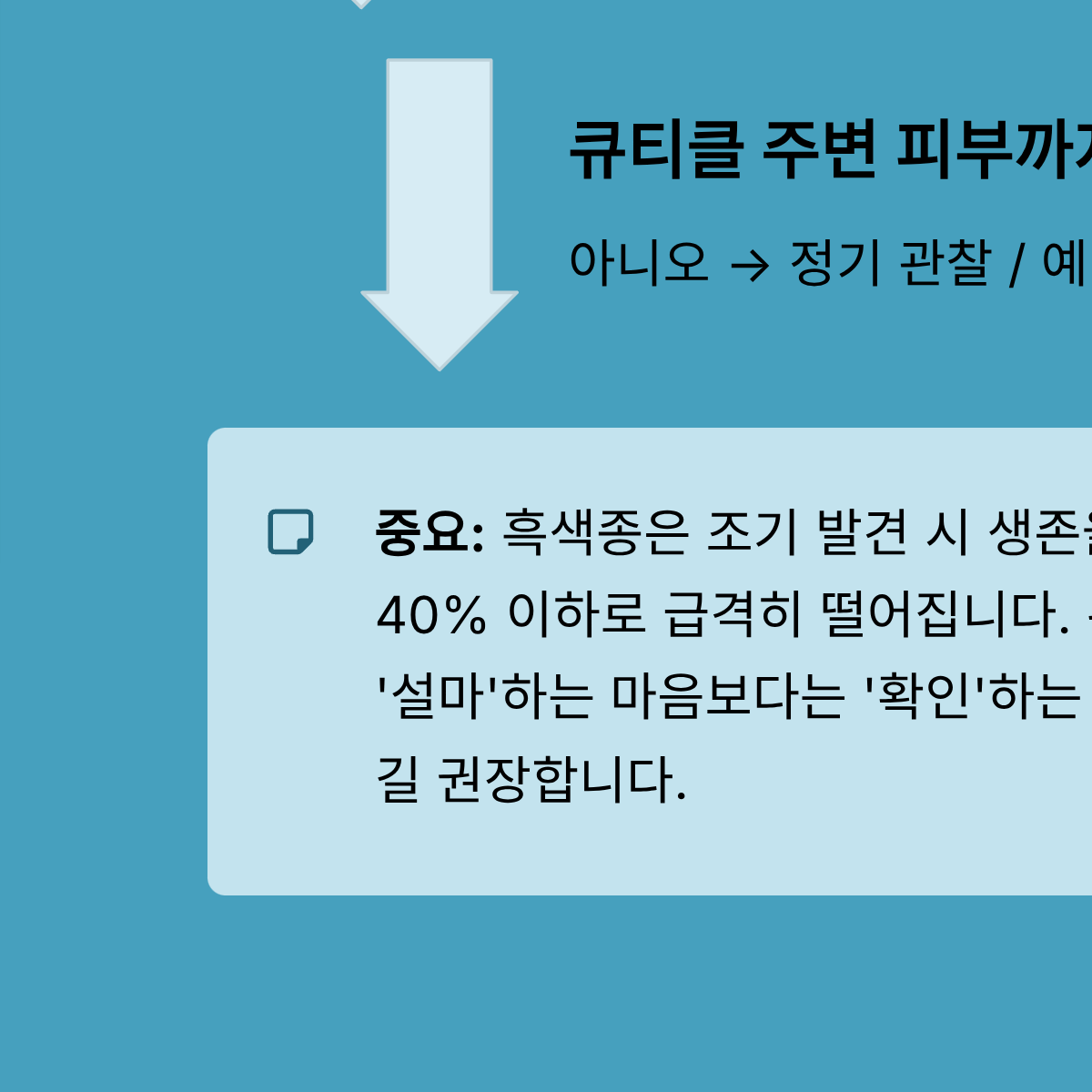 - 실전 적용 팁: 흑색종은 조기 발견 시 생존율이 90% 이상이지만, 전이 후에는 40% 이하로 급격히 떨어집니다. 위 체크리스트 중 2개 이상 해당한다면 '설마'하는 마음보다는 '확인'하는 마음으로 대학병원 피부과를 방문하시길 권장합니다.