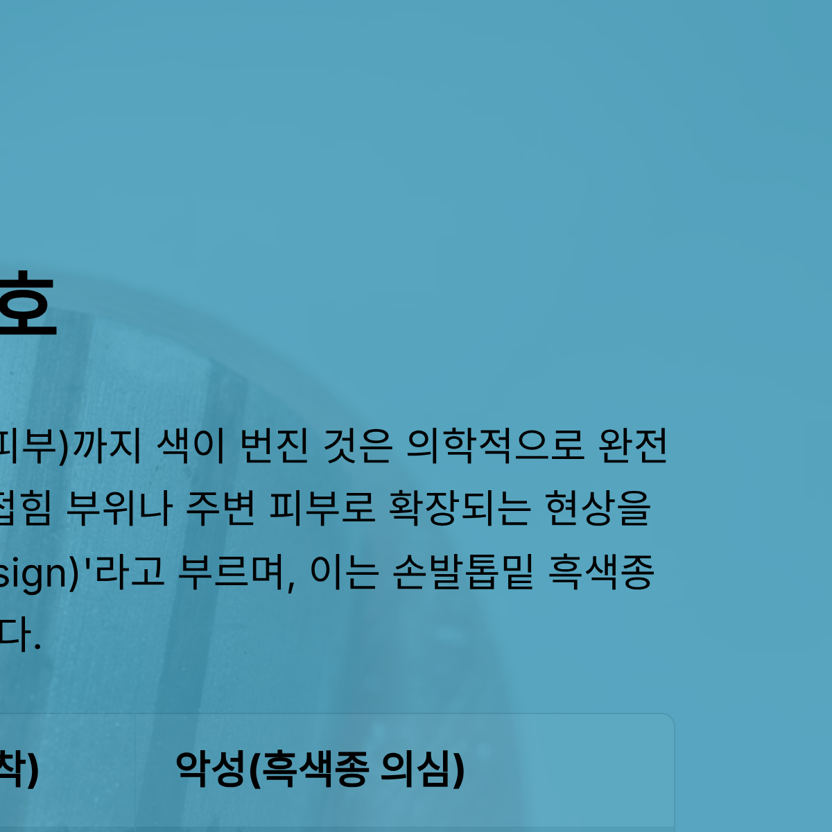 | 색소 범위 | 손톱 판(Nail Plate) 내에 국한됨 | 큐티클, 손톱 주위 피부까지 번짐 | 피부 침범 여부 |