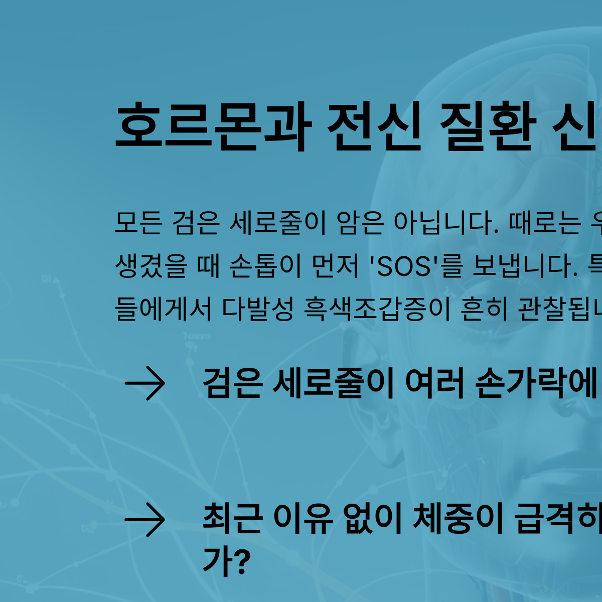단일 손가락의 굵은 줄은 흑색종 가능성이 높지만, 여러 손가락에 나타나는 옅은 줄은 전신적인 호르몬 불균형이나 약물 부작용일 확률이 큽니다.