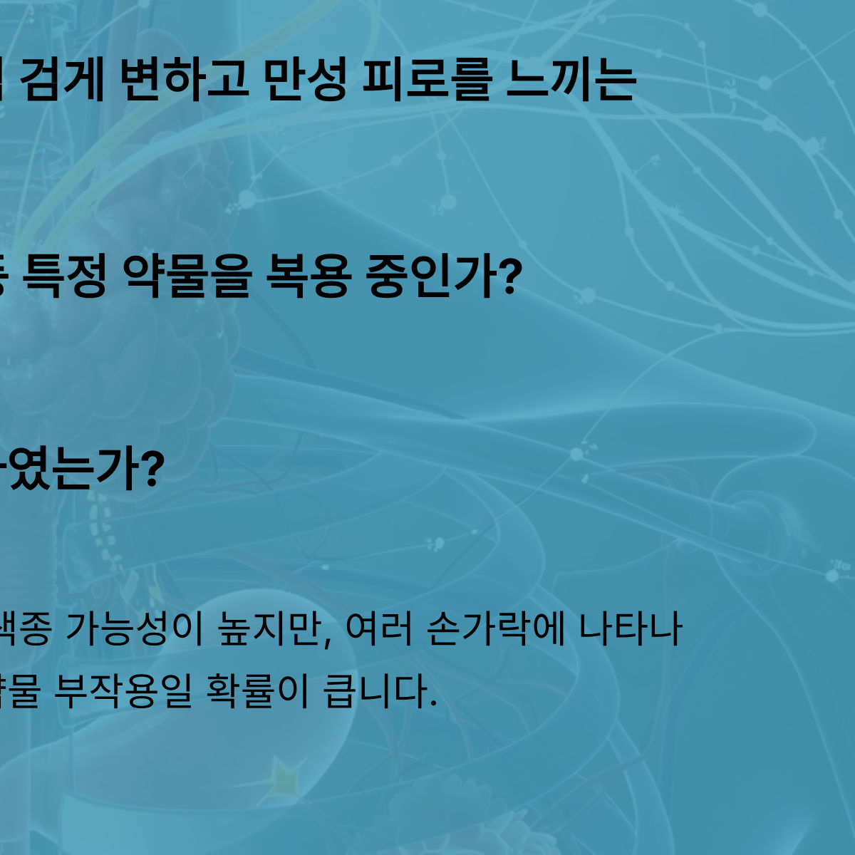 * [ ] 현재 항암제, 항말라리아제 등 특정 약물을 복용 중인가?