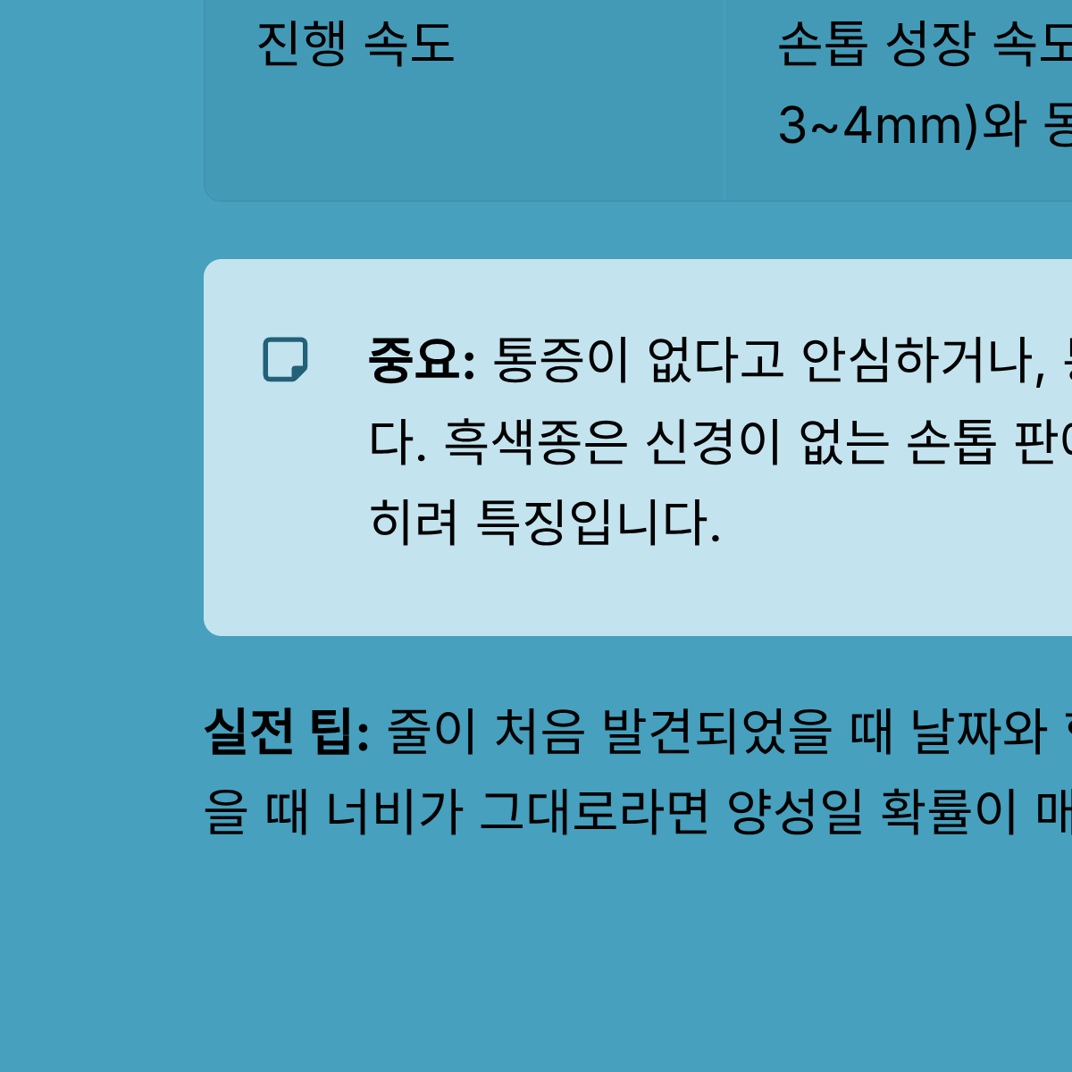 | 진행 속도 | 손톱 성장 속도(월 3~4mm)와 동일 | 줄이 위로 올라가는지, 뿌리에 고정되는지 확인 |