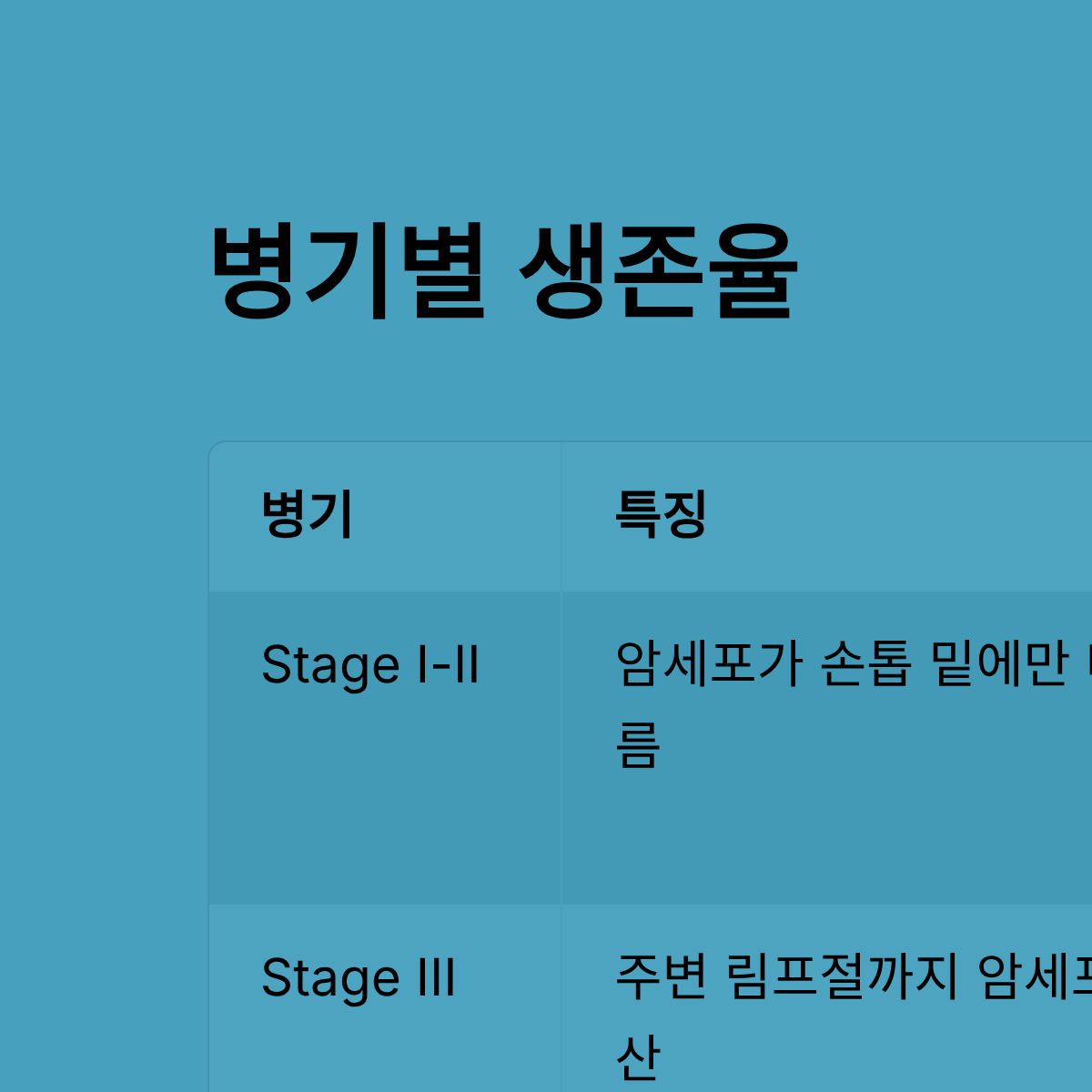 | 국소 단계(Stage I-II) | 암세포가 손톱 밑에만 머무름 | 90% 이상 | 완치 가능성 매우 높음 |