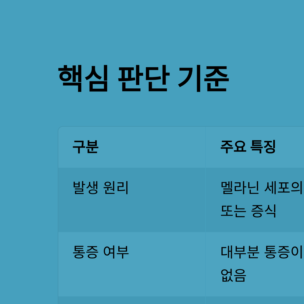 | 구분 | 양성(단순 색소 침착) | 악성(흑색종 의심) | 핵심 판단 기준 |