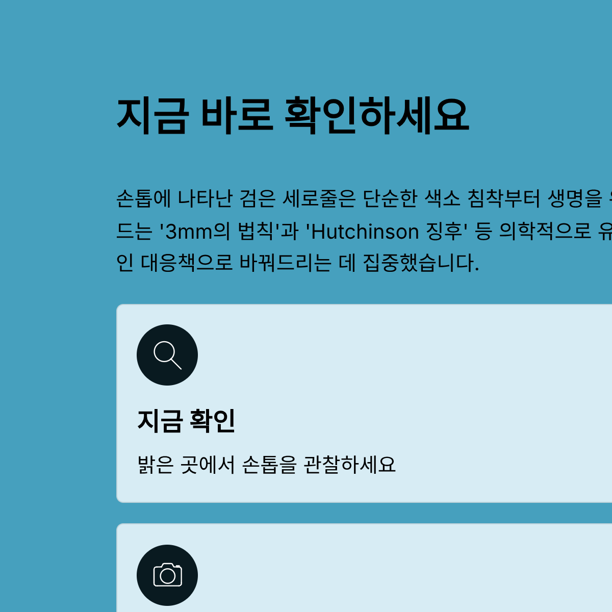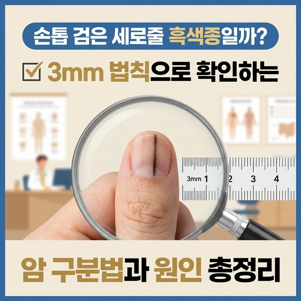 손톱에 나타난 검은 세로줄은 단순한 색소 침착부터 생명을 위협하는 흑색종까지 그 스펙트럼이 매우 넓습니다. 본 가이드는 단순히 증상을 나열하는 것에 그치지 않고, '3mm의 법칙'과 'Hutchinson 징후' 등 의학적으로 유의미한 자가 진단 기준을 제시하여 막연한 불안감을 실질적인 대응책으로 바꿔드리는 데 집중했습니다.