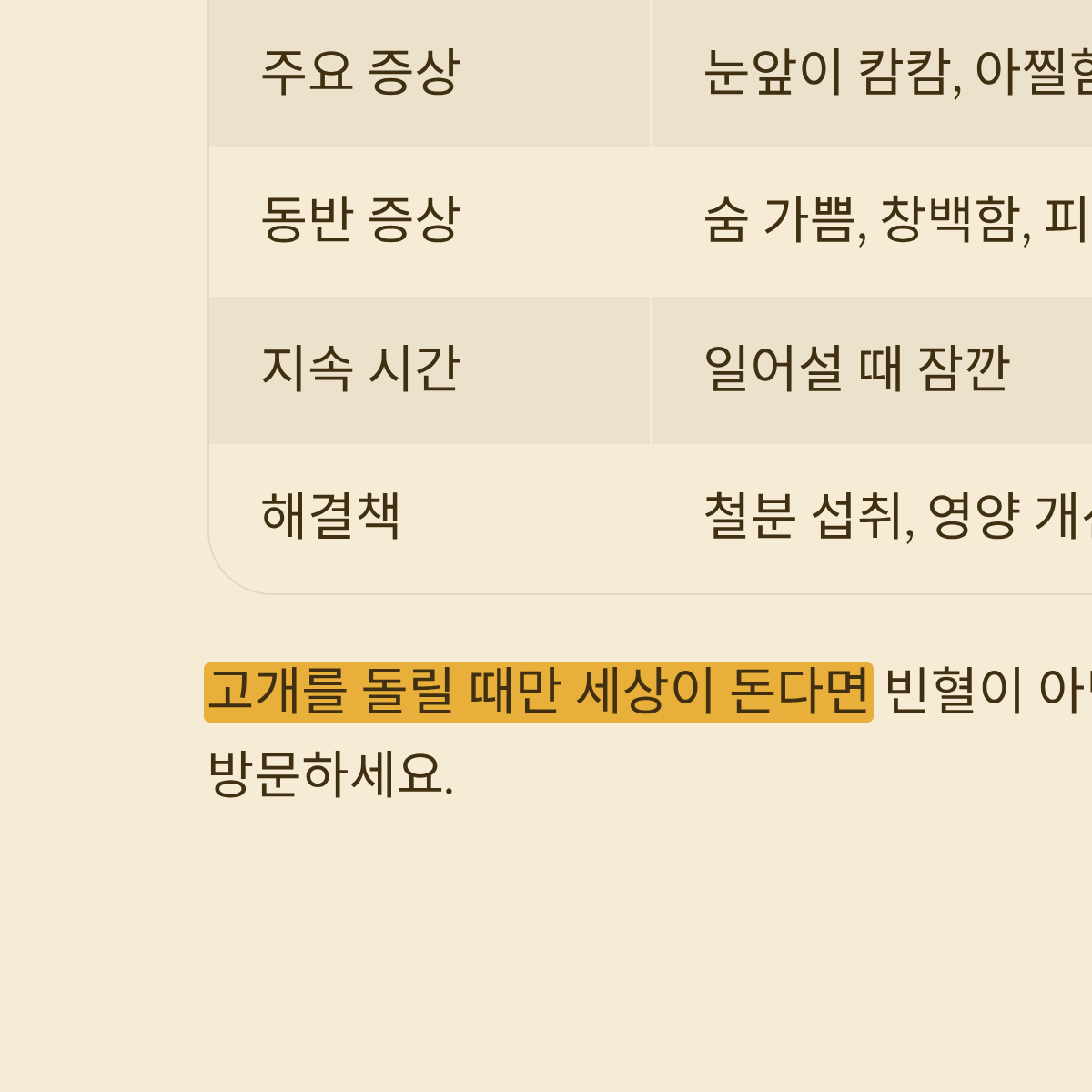 - 실전 적용 팁: 만약 고개를 돌릴 때만 세상이 돈다면 빈혈이 아닌 '이석증'을 의심하고 이비인후과를 먼저 방문하세요.