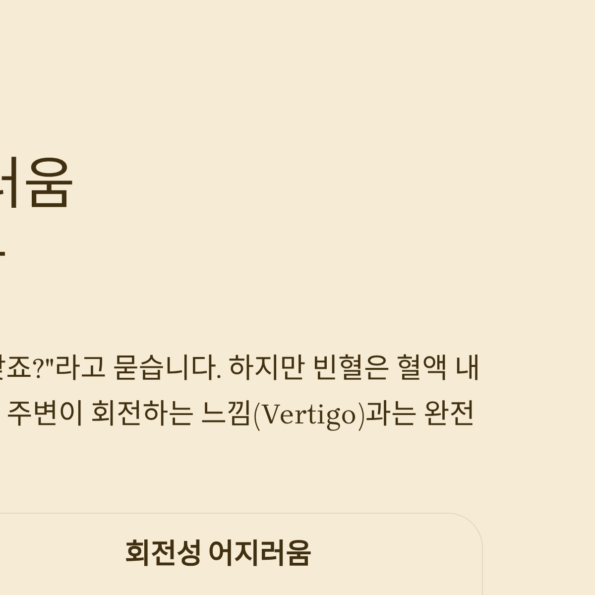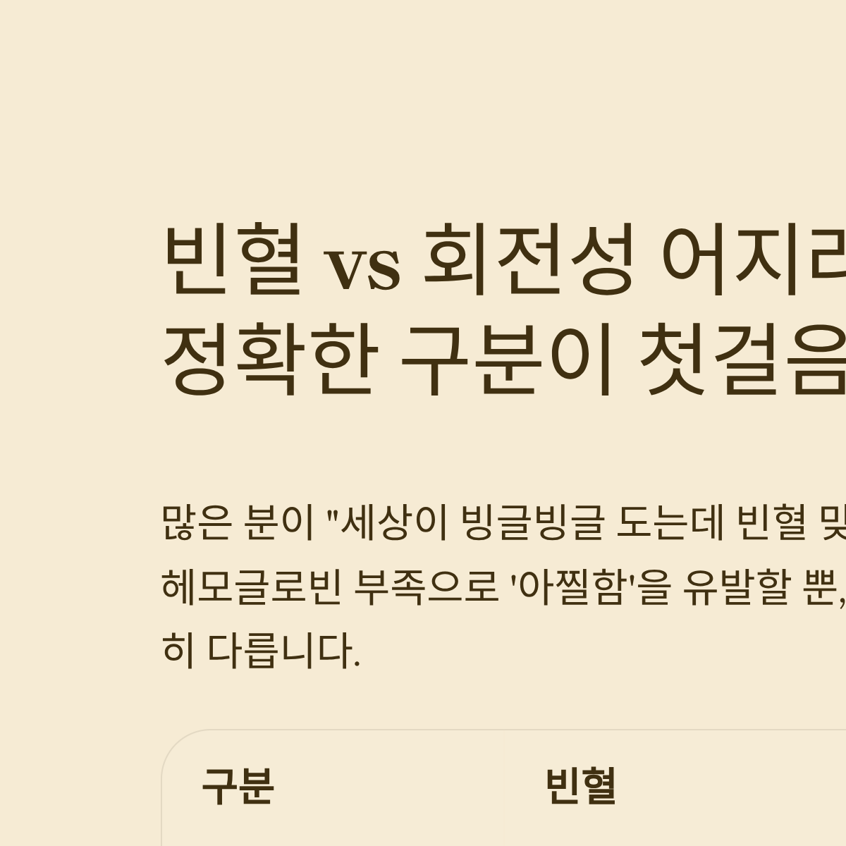 | 구분 | 빈혈 (Anemia) | 회전성 어지러움 (Vertigo) | 핵심 판단 기준 |