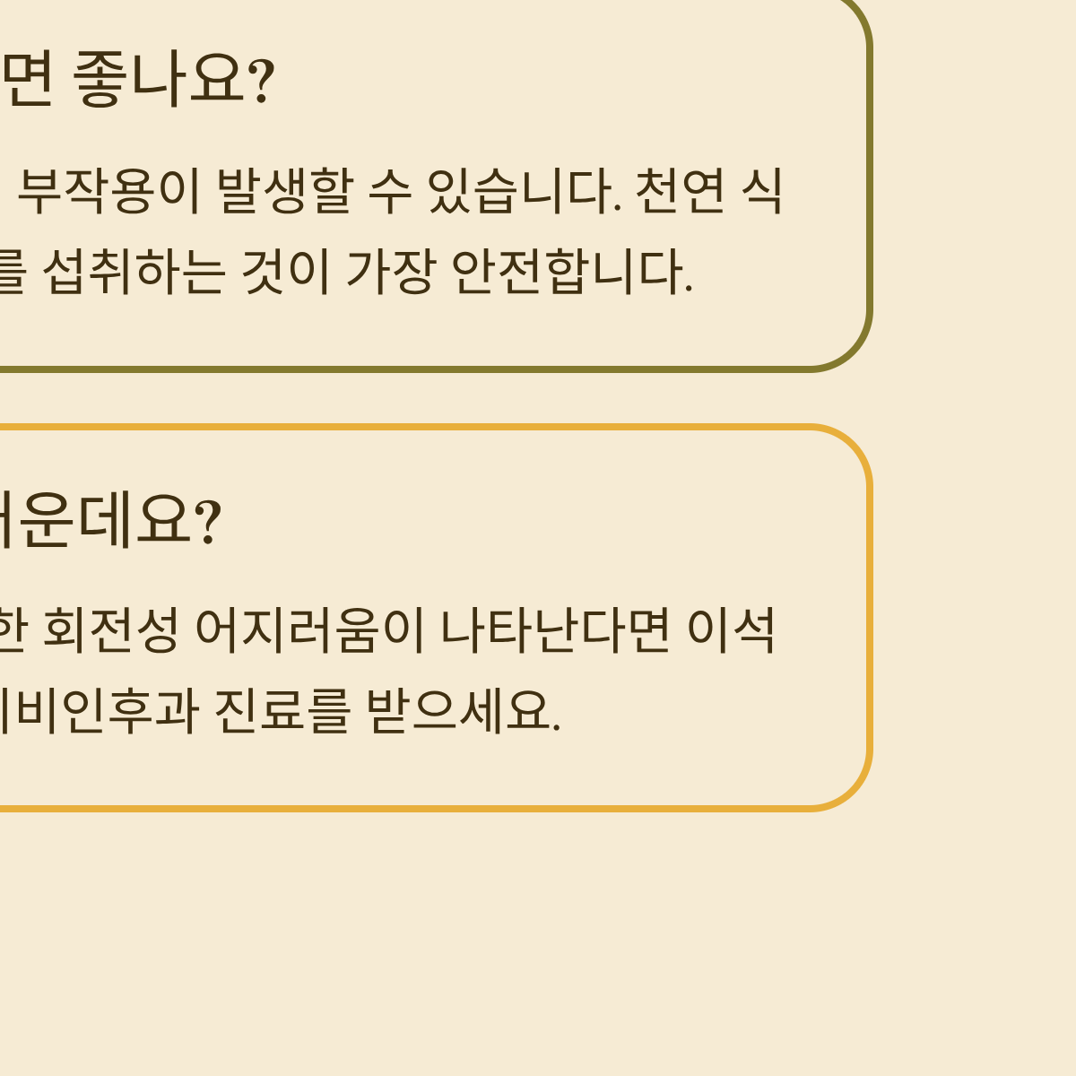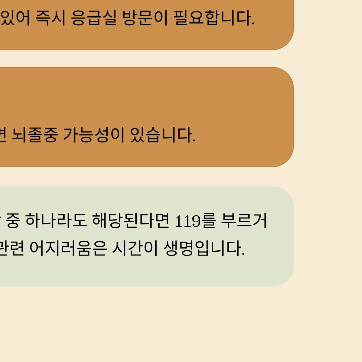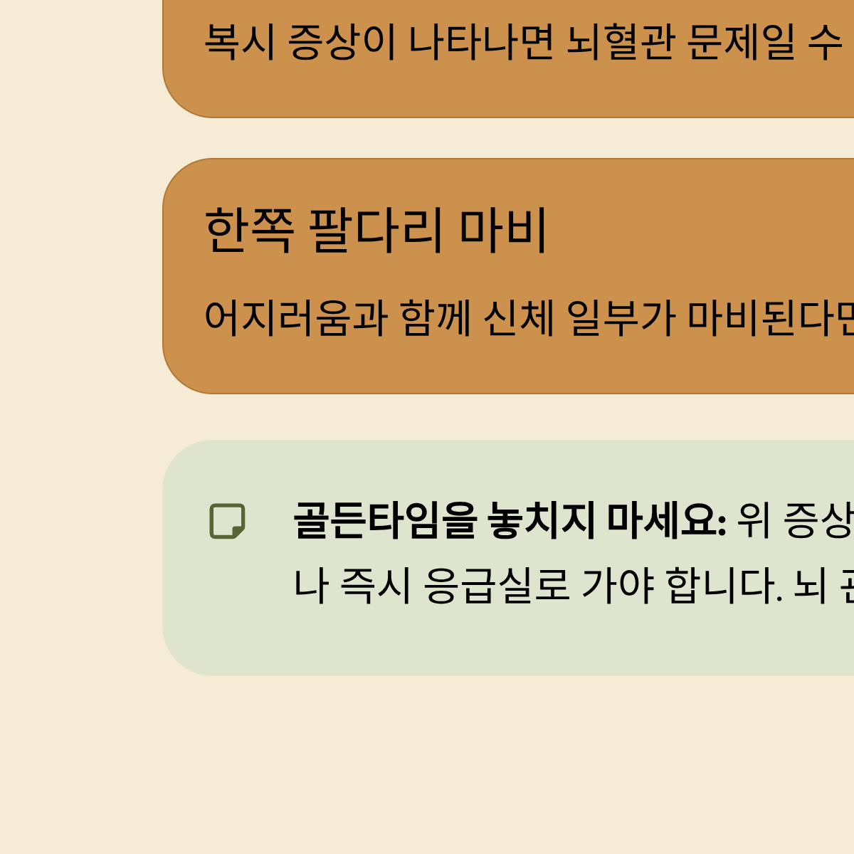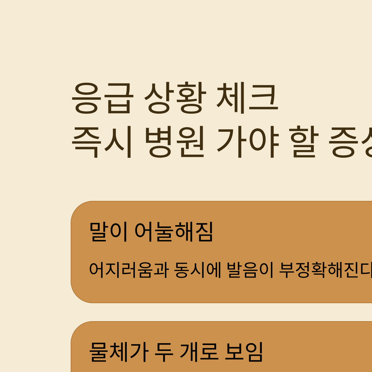 * [ ] 어지러움과 동시에 말이 어눌해지거나 물체가 두 개로 보인다 → 중추성(뇌) 어지러움 (즉시 응급실 방문 필요)