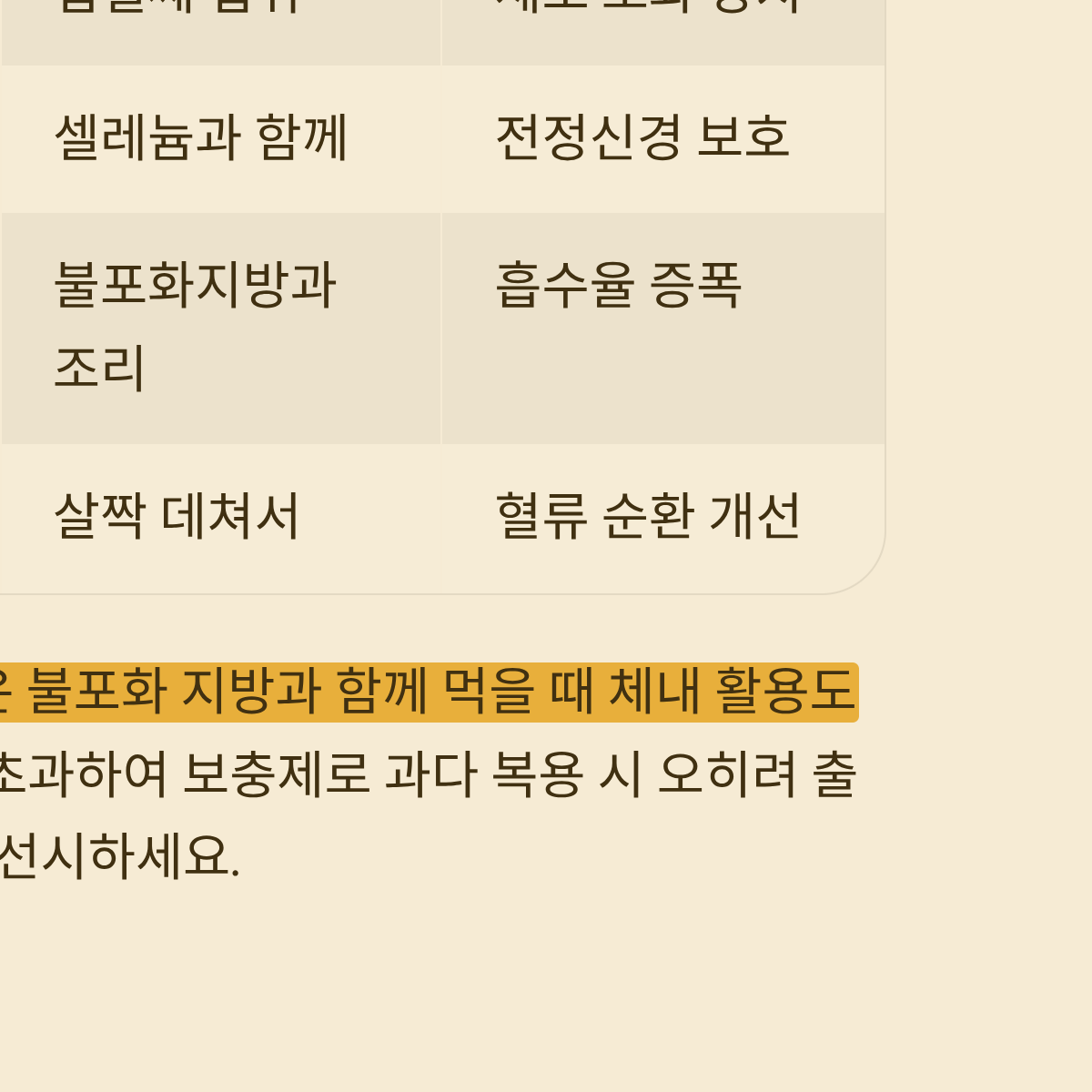 | 아보카도 | 1개당 권장량 28% | 불포화 지방과 함께 조리 | 지용성 비타민 흡수율 증폭 |