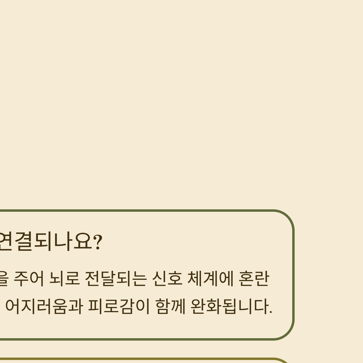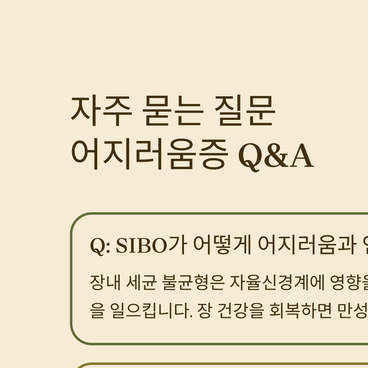 A: 장내 세균 불균형은 자율신경계에 영향을 주어 뇌로 전달되는 신호 체계에 혼란을 일으키고 전신 염증 반응을 유발할 수 있습니다. 장 건강을 회복하여 자율신경이 안정되면 원인 모를 만성 어지러움과 피로감이 함께 완화되는 효과를 기대할 수 있습니다.