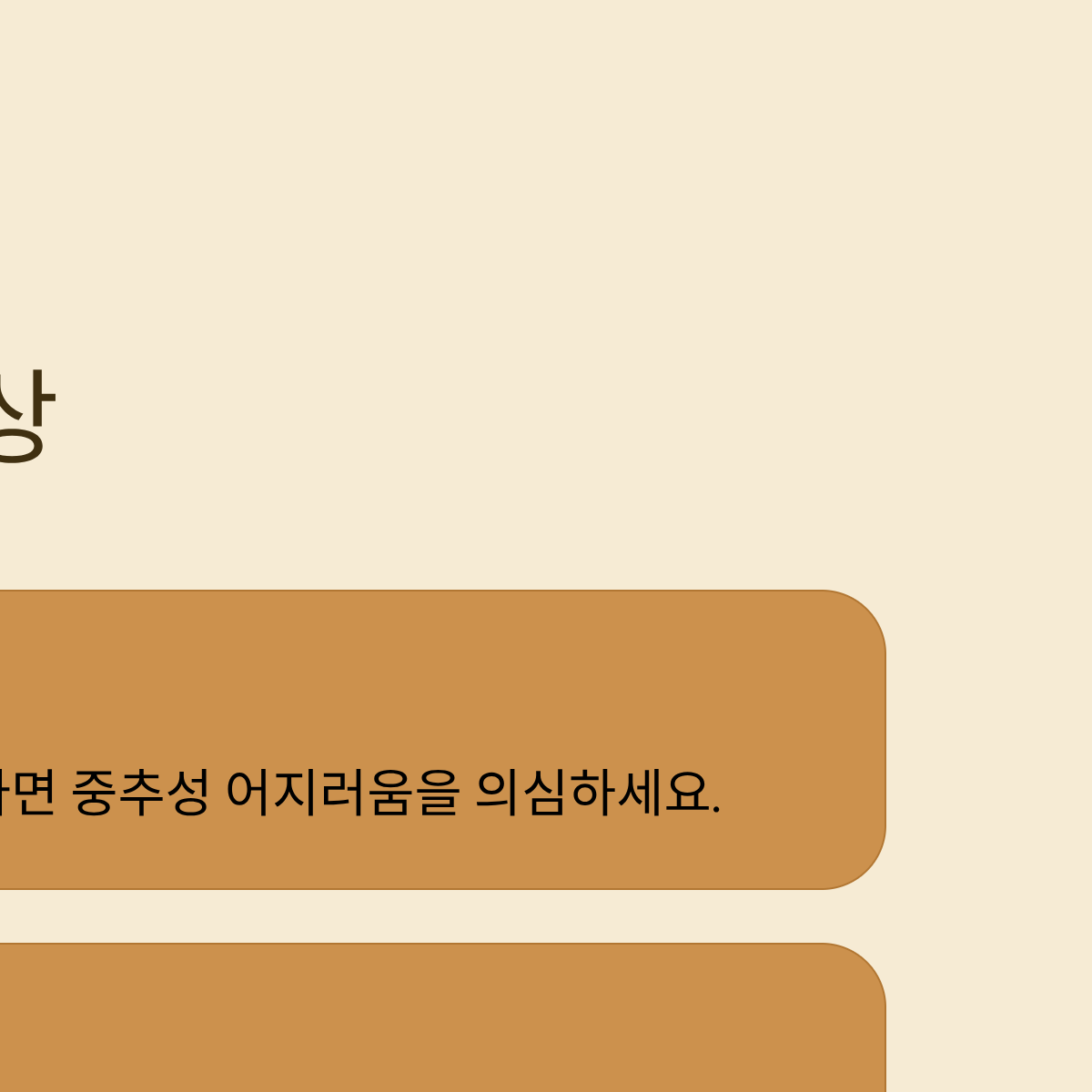 | 동반 증상 | 숨 가쁨, 창백한 안색, 피로감 | 구토, 메스꺼움, 이명(Tinnitus) | 소화기/청각 증상 |