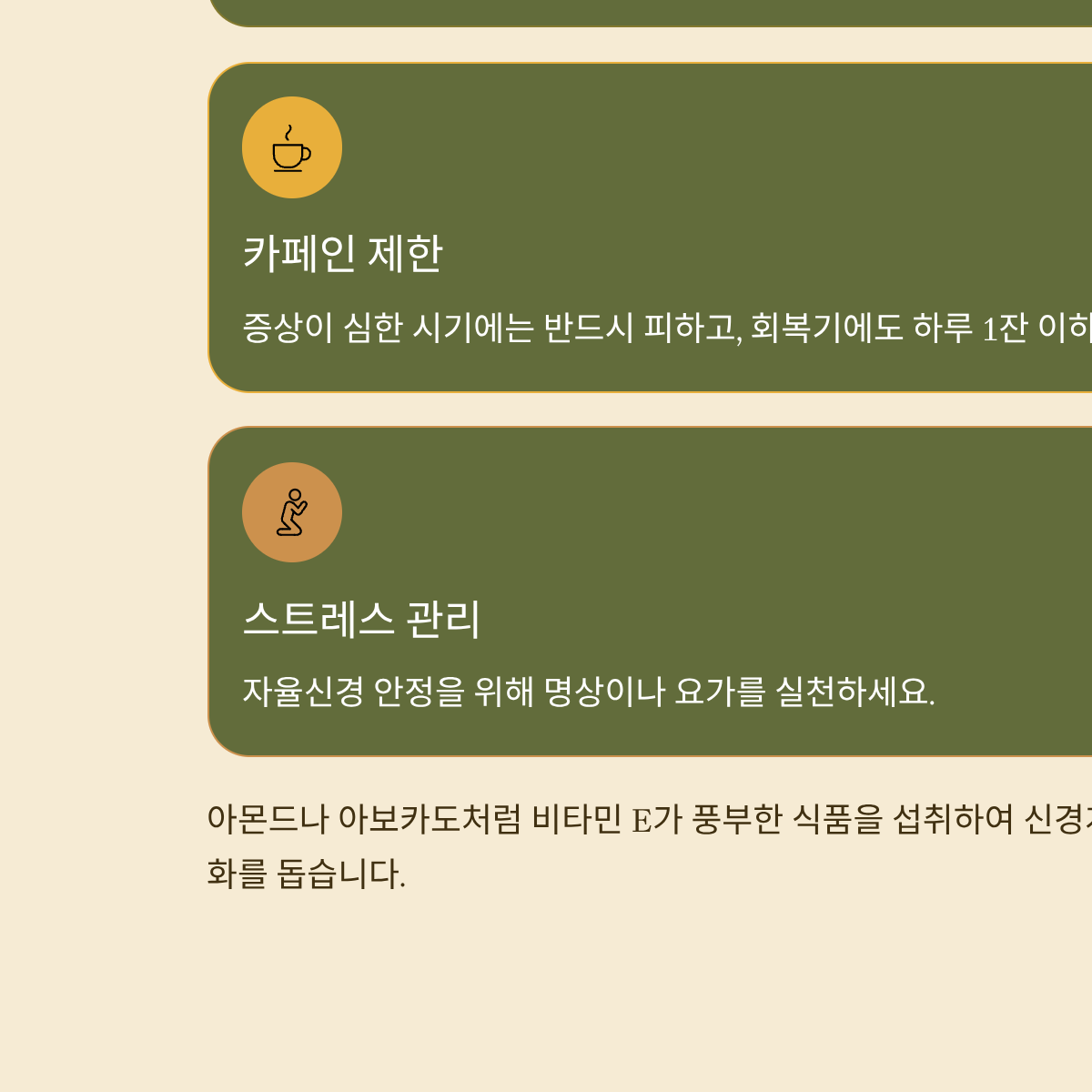 - 실전 적용 팁: 식단에서 밀가루와 설탕을 줄이고, 아몬드나 아보카도처럼 비타민 E가 풍부한 식품을 섭취하여 신경계를 보호하세요. 비타민 E는 활성산소를 억제해 자율신경의 안정화를 돕습니다.