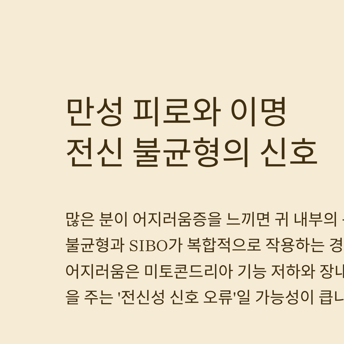 많은 분이 어지러움증을 느끼면 귀 내부의 문제(이석증 등)만 의심하지만, 실제 임상 현장에서 보면 자율신경계(Autonomic Nervous System)의 불균형과 소장 내 세균 과증식(SIBO, Small Intestinal Bacterial Overgrowth)이 복합적으로 작용하는 경우가 많습니다. 특히 만성 피로를 동반하는 어지러움은 단순한 평형감각의 문제가 아니라, 신체 에너지를 생성하는 미토콘드리아 기능 저하와 장내 환경 악화가 뇌로 가는 신경 신호에 혼선을 주는 '전신성 신호 오류'일 가능성이 큽니다.