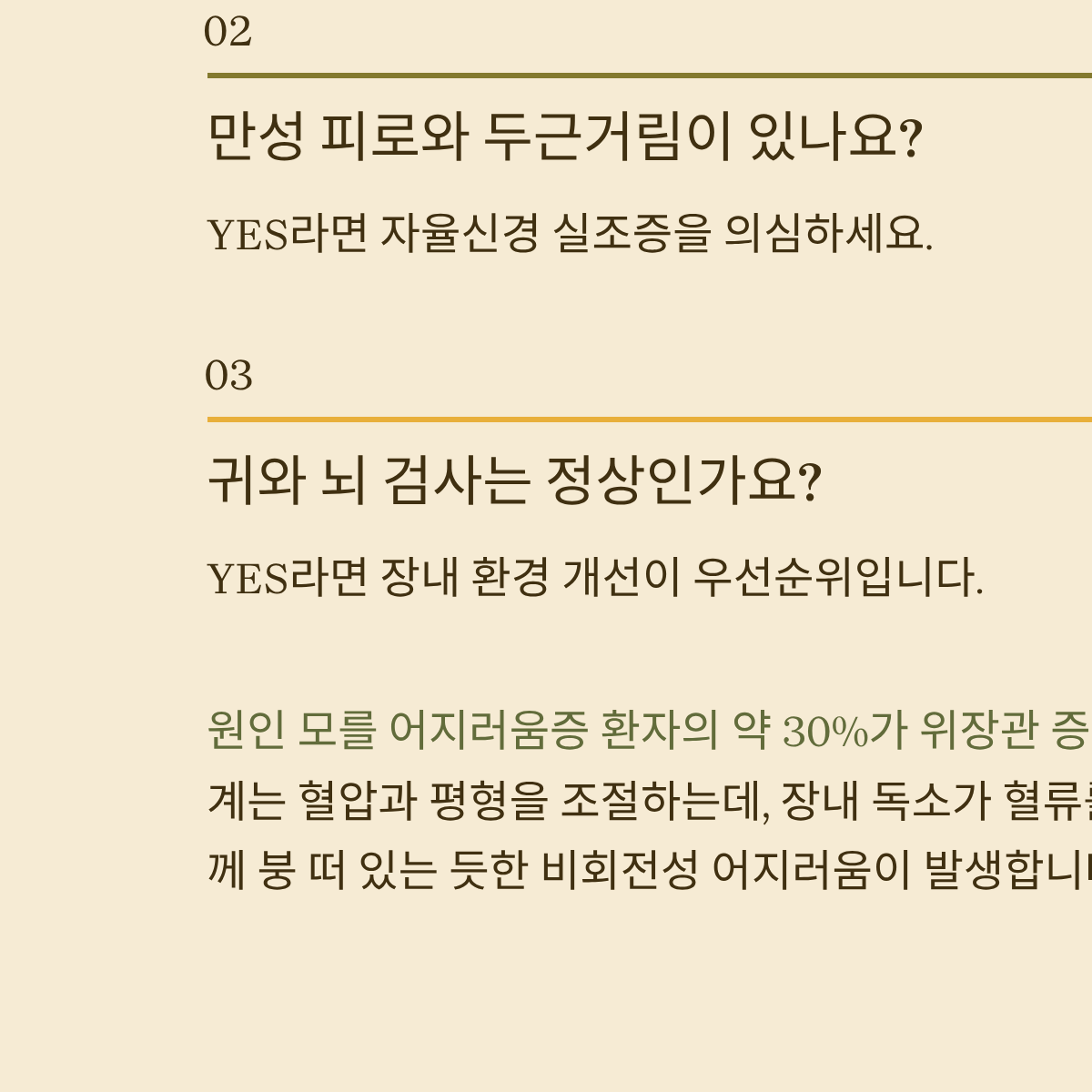 3. 검사상 귀와 뇌에 이상이 없는데 어지러운가요? (Yes → 장내 환경 개선이 우선순위)