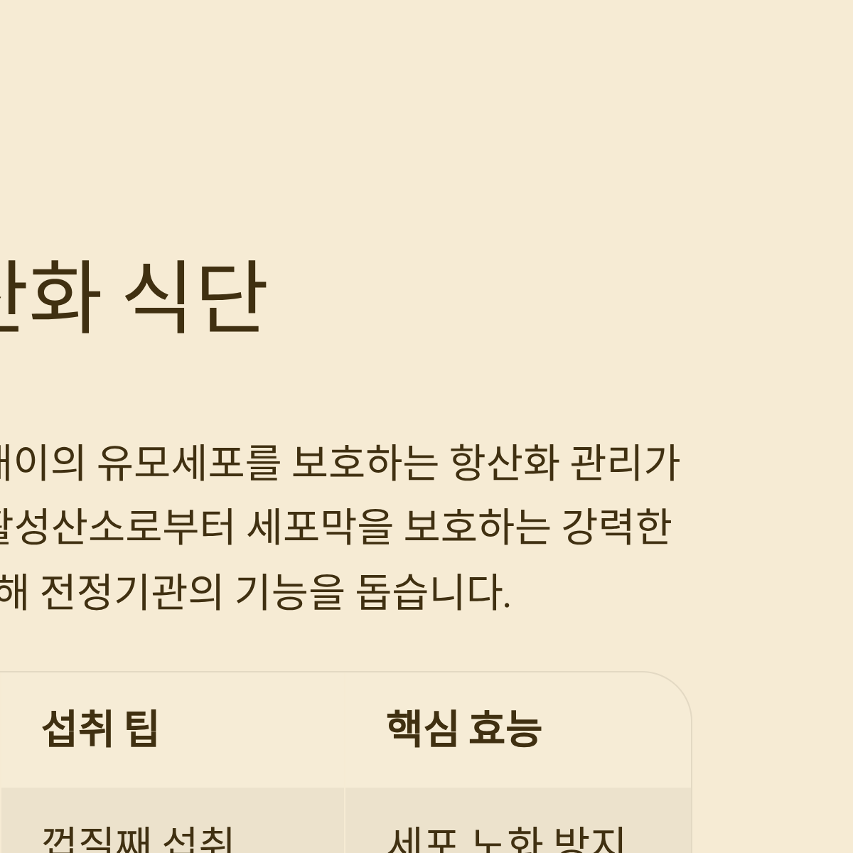 | 식품명 | 주요 성분 및 함량 (28g 기준) | 흡수 최적화 팁 | 핵심 판단 기준 (효능) |