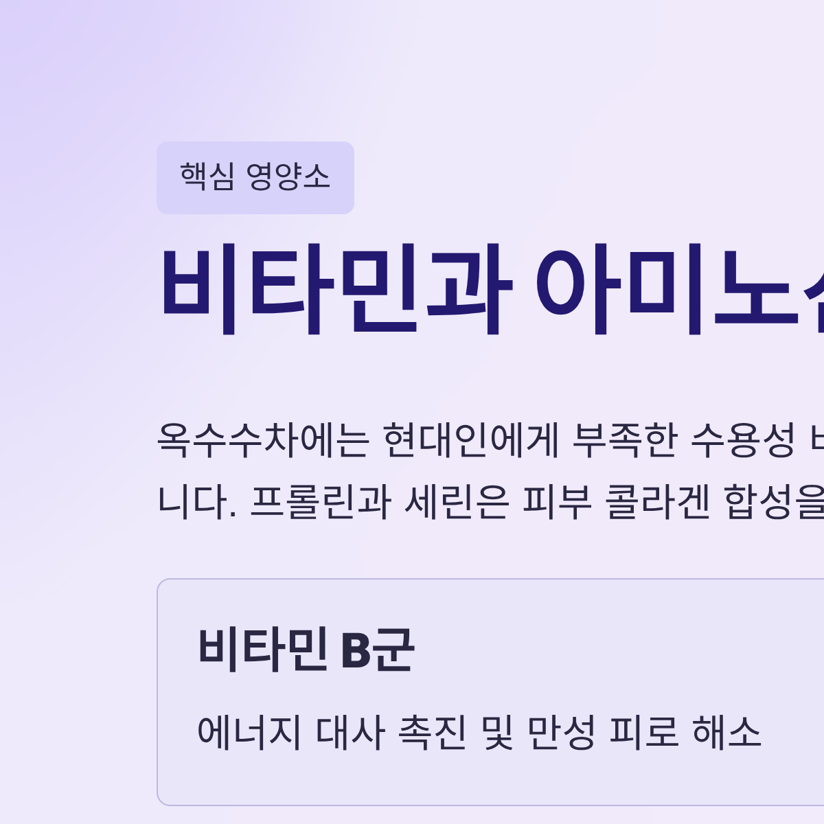 옥수수차는 단순한 수분 보충원이 아닙니다. 옥수수 알갱이에는 현대인에게 부족하기 쉬운 수용성 비타민과 필수 아미노산이 응축되어 있습니다. 특히 옥수수차에 풍부한 프롤린(Proline)과 세린(Serine)은 피부 콜라겐 합성을 돕고 대사 기능을 활성화하는 역할을 합니다.