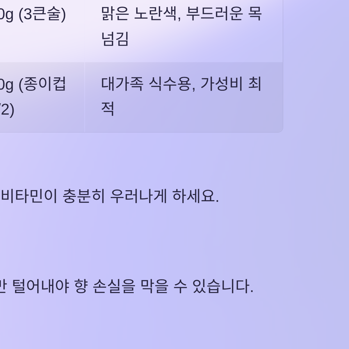 | 연한 맛 (식수용) | 2L | 20g (약 3큰술) | 약불 15분 | 맑은 노란색, 목 넘김이 부드러움 |