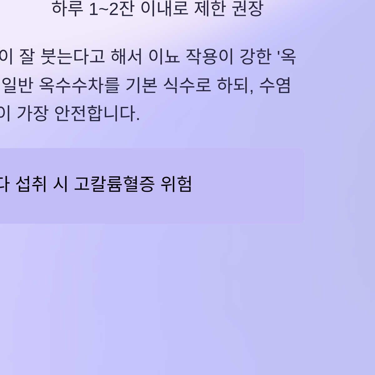 옥수수차는 훌륭한 수분 공급원이지만, 몸이 잘 붓는다고 해서 이뇨 작용이 강한 '옥수수수염차'만 고집하는 것은 위험합니다. 일반 옥수수차를 기본 식수로 하되, 수염차는 하루 1~2잔 기호식품으로 즐기는 것이 가장 안전한 건강 루틴입니다.