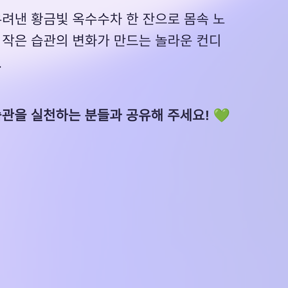 시중의 단편적인 정보와 달리, 원재료의 품질을 선별하는 안목과 구기자와의 배합 등 과학적 근거에 기반한 섭취법은 여러분의 건강 관리를 한 단계 더 격상시켜 줄 것입니다. 오늘부터 커피나 가공음료 대신, 정성껏 우려낸 황금빛 옥수수차 한 잔으로 몸속 노폐물을 비우고 맑은 에너지를 채워보시길 바랍니다. 작은 습관의 변화가 만드는 놀라운 컨디션의 차이를 직접 경험해 보세요.