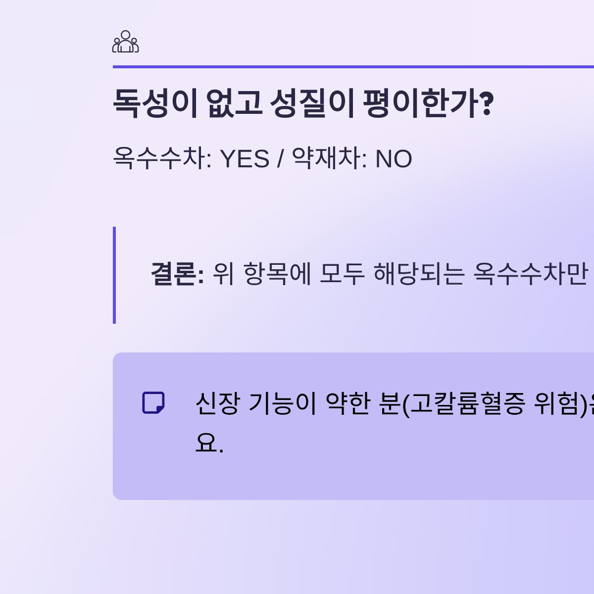 - [ ] 독성이 없고 성질이 평이한가? (옥수수차: YES / 약재차: NO)