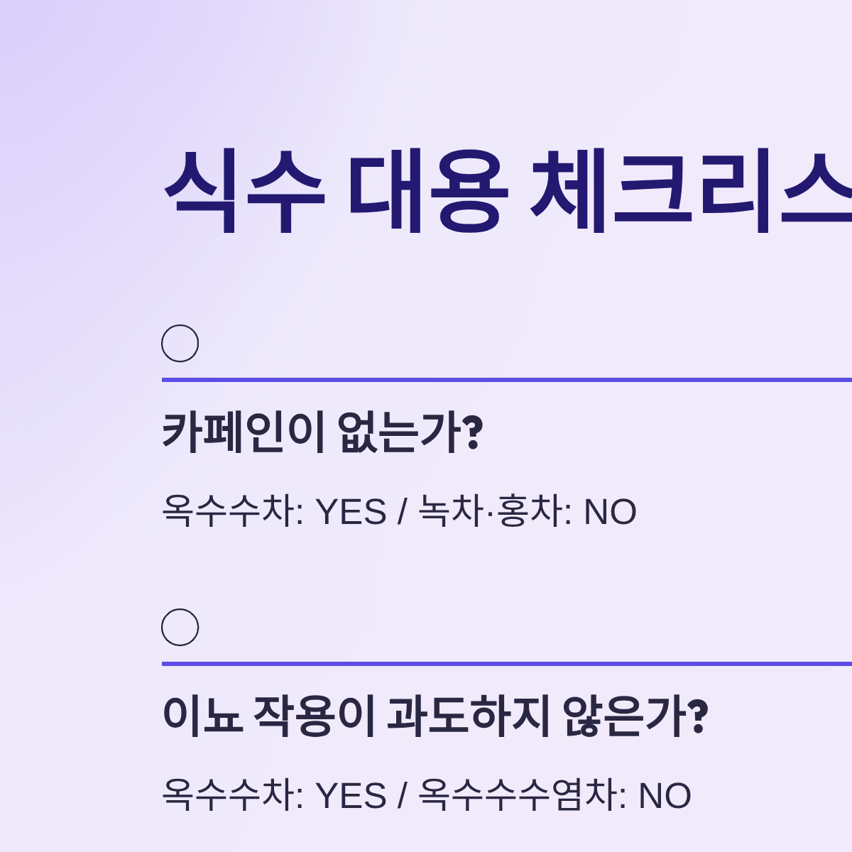 - [ ] 카페인이 없는가? (옥수수차: YES / 녹차, 홍차: NO)