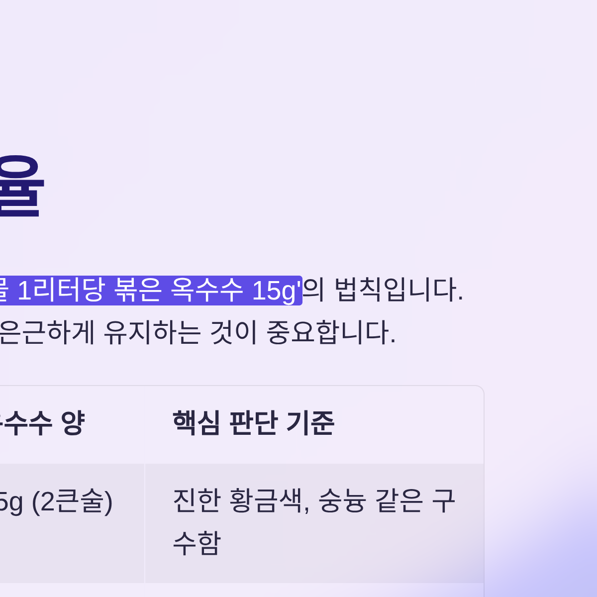 | 구분 | 물의 양 | 볶은 옥수수 양 | 추천 가열 시간 | 핵심 판단 기준 (맛/색상) |
