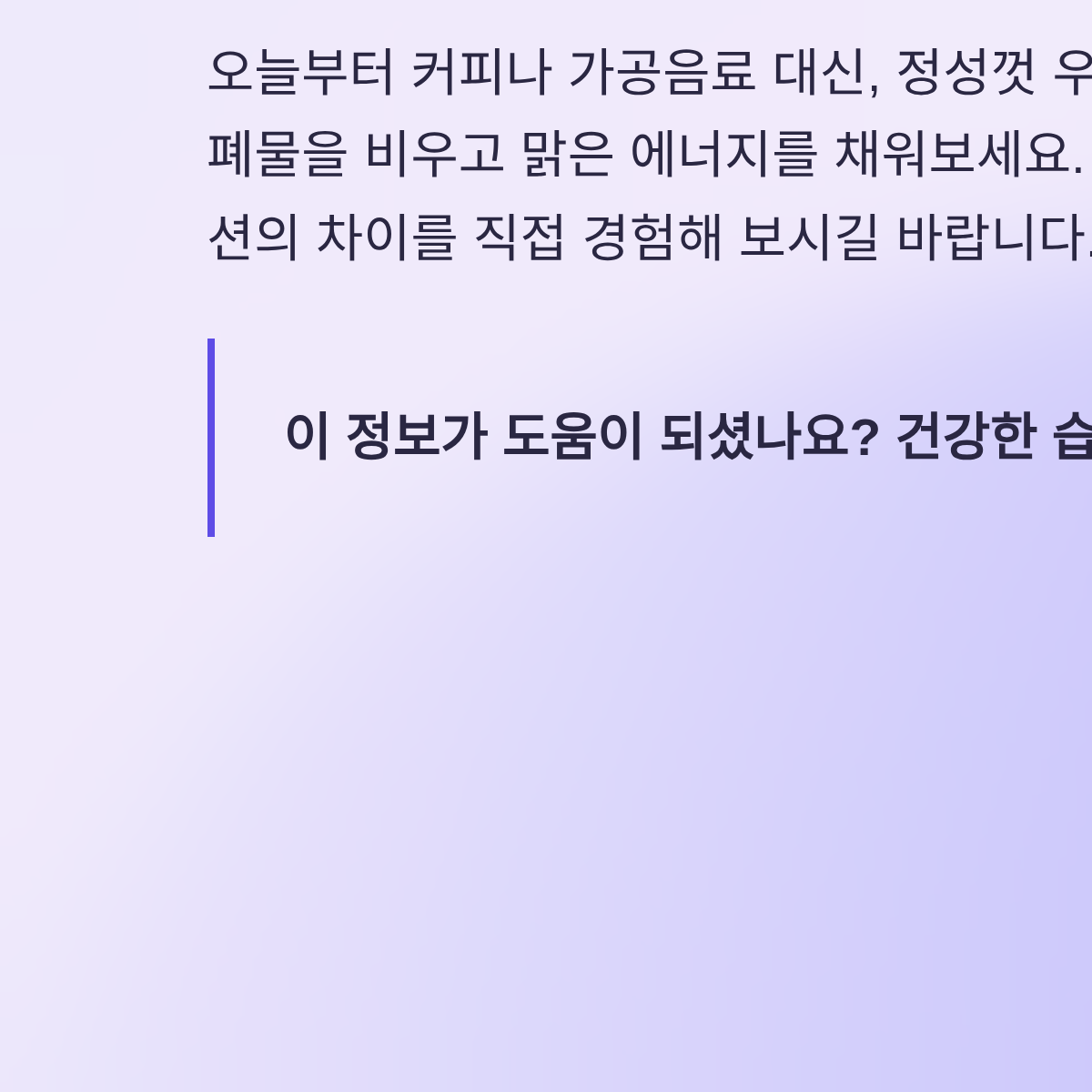 옥수수차는 단순한 기호식품을 넘어, 일상 속 수분 보충을 책임지는 가장 안전하고 영양가 높은 선택지입니다. 본 가이드를 통해 살펴본 것처럼, 옥수수차는 이뇨 작용이 강한 '옥수수수염차'와 달리 물 대신 마실 수 있는 최적의 대안이며, 볶는 과정에서 생성되는 항산화 성분은 우리 몸의 피로 회복을 돕는 핵심 열쇠가 됩니다.