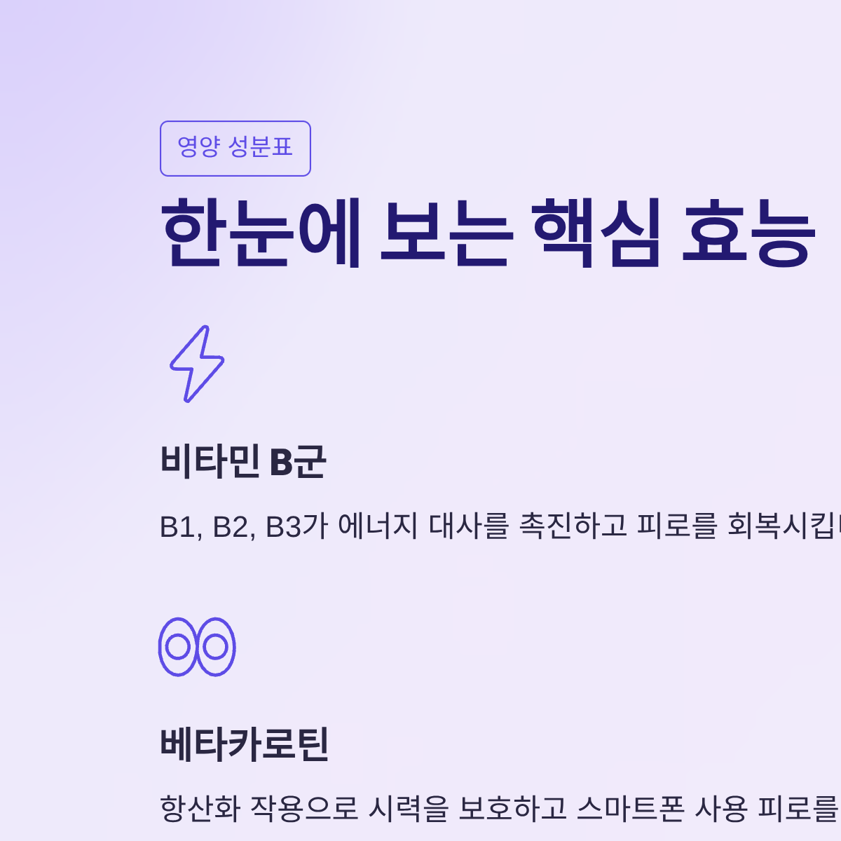 | 베타카로틴 (Beta-carotene) | 항산화 작용 및 시력 보호 | 스마트폰 사용 피로 완화 |