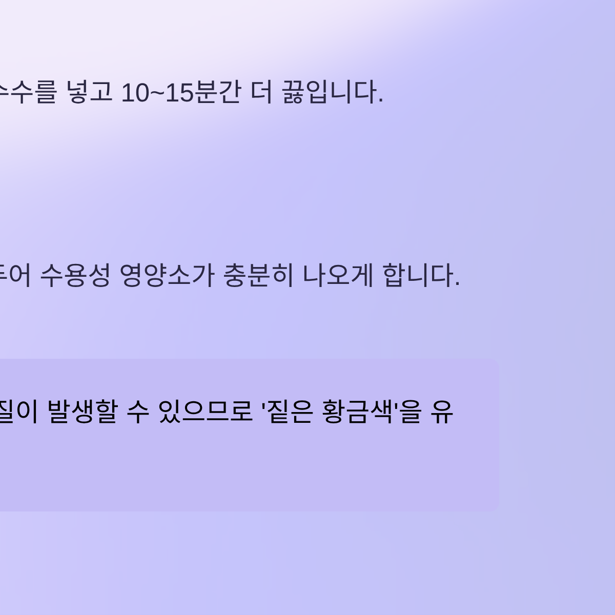 * 잔열 활용: 불을 끈 후 바로 옥수수를 건져내지 말고, 5분 정도 그대로 두어 수용성 비타민이 충분히 우러나게 하세요.
