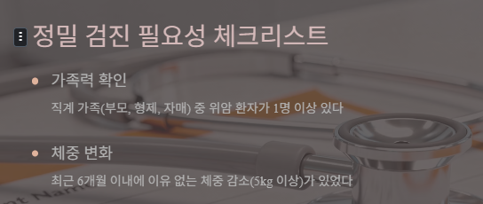 [위내시경 정밀 검진 필요성 체크리스트] * [ ] 직계 가족(부모, 형제, 자매) 중 위암 환자가 1명 이상 있다. * [ ] 최근 6개월 이내에 이유 없는 체중 감소(5kg 이상)가 있었다. * [ ] 2주 이상 지속되는 상복부 통증이나 속 쓰림이 있다. * [ ] 과거 내시경에서 '위축성 위염'이나 '장상피화생' 판정을 받은 적이 있다. * [ ] 헬리코박터균(Helicobacter pylori) 감염 치료를 받은 적이 없거나 제균 여부를 모른다.