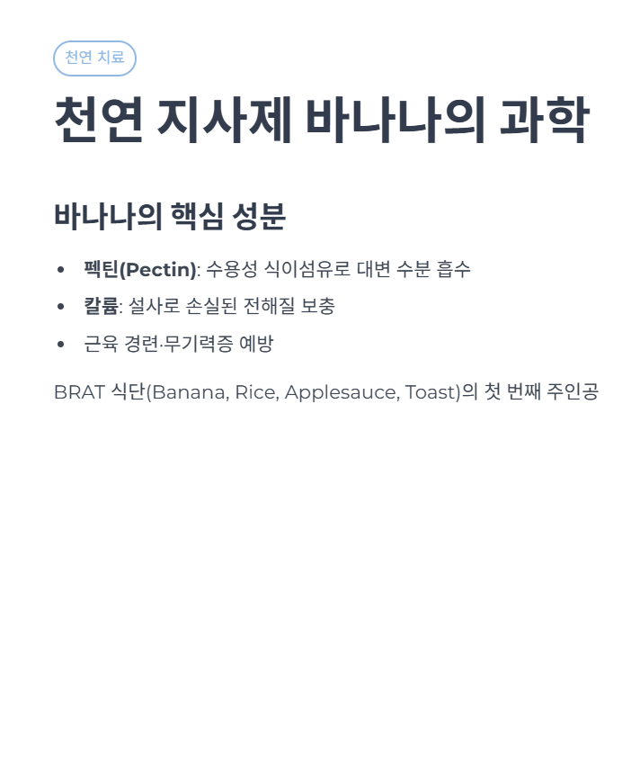 | 바나나 | 강력 권장 | 펙틴, 칼륨 (변을 단단하게 함) | 으깨서 조금씩 섭취, 너무 익은 것은 피할 것 |