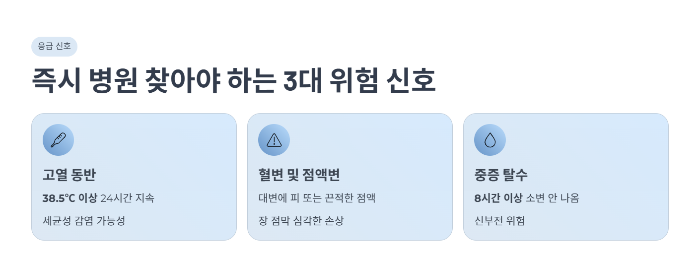 | 중증 탈수 | 8시간 이상 소변 안 나옴, 입술 갈라짐 | 신부전(Kidney Failure) 및 전해질 불균형 위험 |