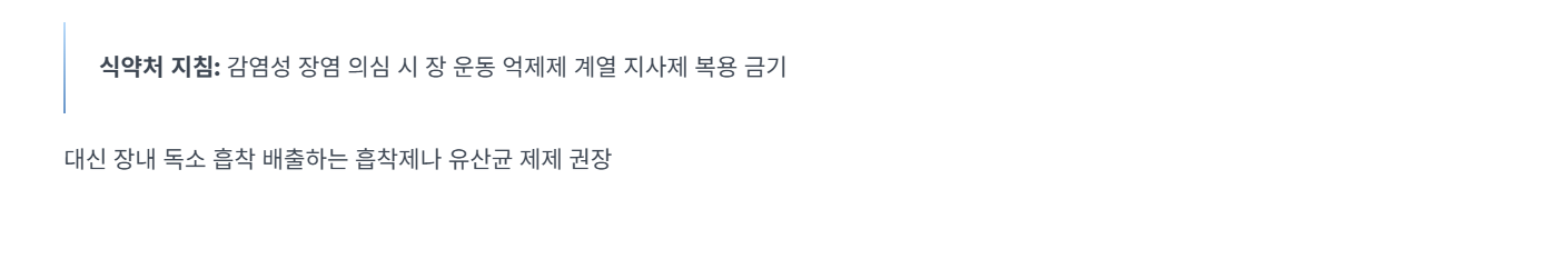 식품의약품안전처의 의약품 안전 지침에 따르면, 감염성 장염이 의심될 때는 장 운동 억제제 계열의 지사제 복용을 금기시합니다. 대신 장내 독소를 흡착해 배출하는 흡착제나 유산균 제제를 권장합니다.