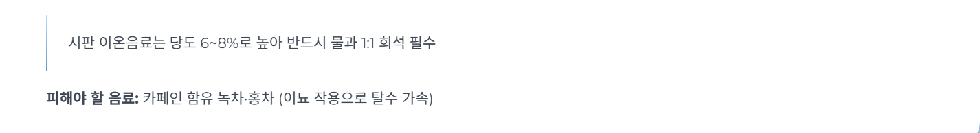 * 주의: 시판 이온음료는 당도가 6~8%로 높아 반드시 물과 1:1로 섞어야 설사가 악화되지 않음