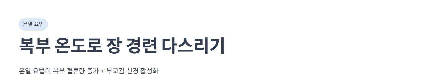 - 실전 적용 팁: 찜질 팩이 없다면 수건을 물에 적셔 전자레인지에 1~2분 돌린 후 비닐팩에 넣어 사용하세요. 통증이 심한 하복부에 15분간 올려두는 것이 가장 좋습니다.