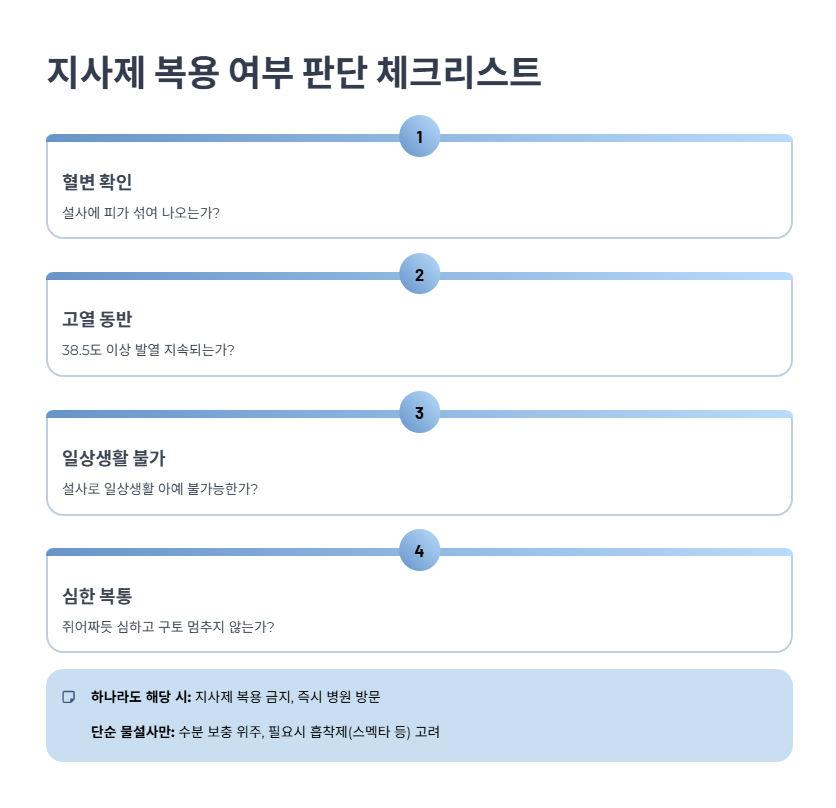 - 위 항목 중 하나라도 해당 시: 지사제 복용 금지, 즉시 병원 방문