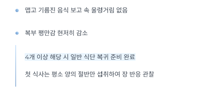 | 금식 종료 시점 | 복통이 가라앉고 허기가 느껴질 때 | 장음(꼬르륵 소리) 정상화 | 미음이나 쌀죽으로 아주 천천히 시작 |