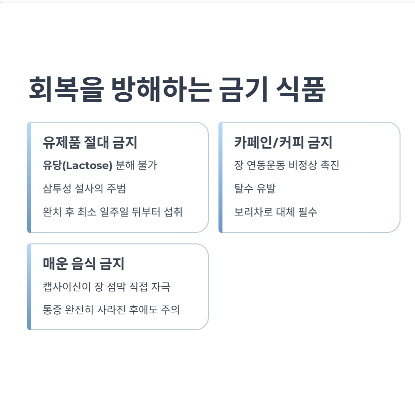 | 유제품 | 절대 금지 | 유당 (분해 효소 부족으로 설사 유발) | 완치 후 최소 일주일 뒤부터 섭취 |